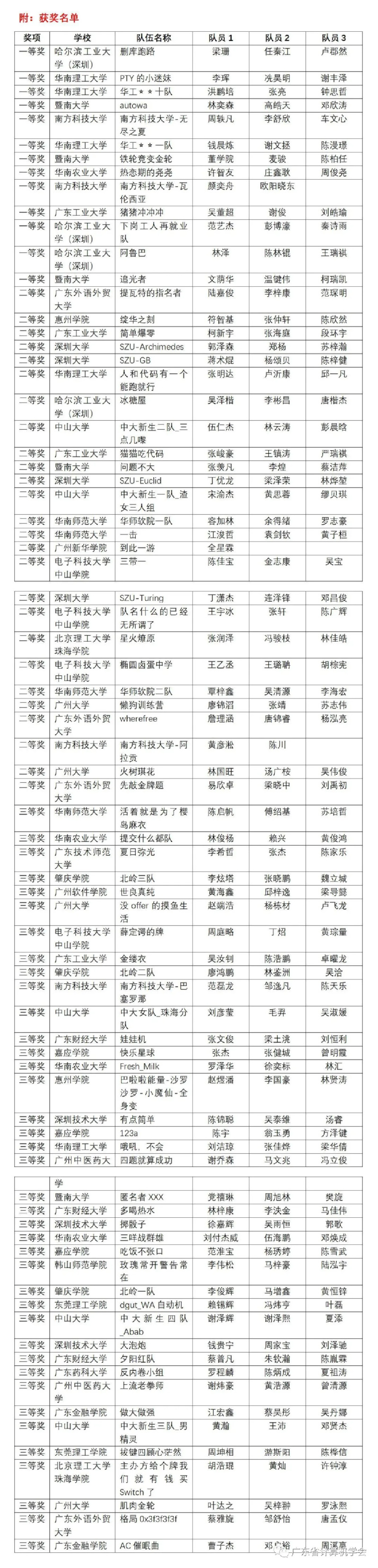 据悉,本年度比赛中,广东省内32所高校180支队伍共500多名队员参赛。最终,共13支队伍获得一等奖,26支队伍获得二等奖,39支队伍获得三等奖(文末附本次竞赛获奖名单)。