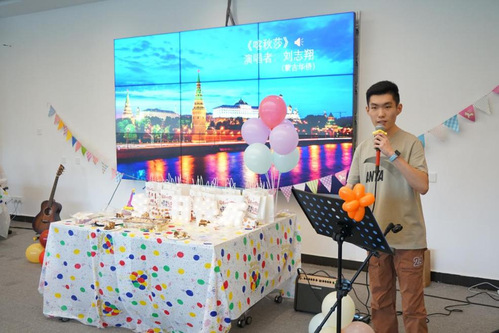 紧接着,周书记、杨院长和刘主任为大家点燃生日蜡烛,全体师生合唱生日歌,为寿星们送上最美好的祝福。蒙古华侨学生刘志翔应邀为大家演唱俄语歌曲《喀秋莎》和《莫斯科郊外的晚上》,赢得阵阵掌声。