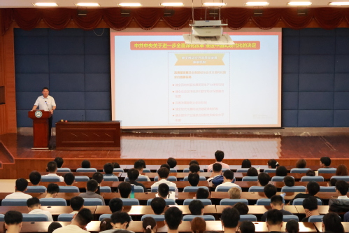 周玉宇充分挖掘学校红色文化、校史资源,讲述百年暨南栉风沐雨、与党同心的办学发展历史,进一步深入推动党史、统一战线史与校史学习教育相结合,厚植红色基因,传承“暨南精神”。介绍学院勇立潮头、锐意进取的奋斗史,加强体系化建设的改革思路、构建“党建领航+思政赋能+科技竞赛”的实践育人体系以及“校企双主体”深度融合的人才培养模式。重点深入宣讲习近平总书记在党的二十届三中全会上的重要讲话精神、《中共中央关于进一步全面深化改革推进中国式现代化的决定》。通过全面、准确、深入宣讲辅导,教育引领学院全体新生凝心聚力、奋发进取,奋力谱写为中国式现代化挺膺担当的青春篇章。