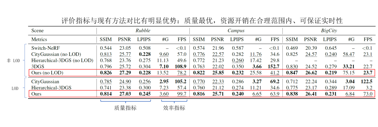 提出创新的分区内资源优先调度策略,在显著降低显存占用的同时提升重建速度;同时提出了可控细节层次(Level of Detail, LOD)生成策略,实现自底向上的多尺度建模,确保城市级场景的实时渲染性能。