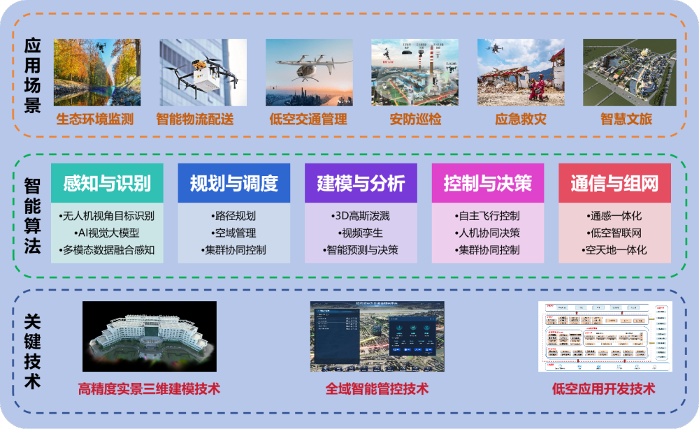 依托城市级实景三维重建技术,团队成功研发了“低空经济数字底座”。通过“关键技术-智能算法-应用场景”三位一体的创新架构,打造面向未来的低空经济数字基础设施。