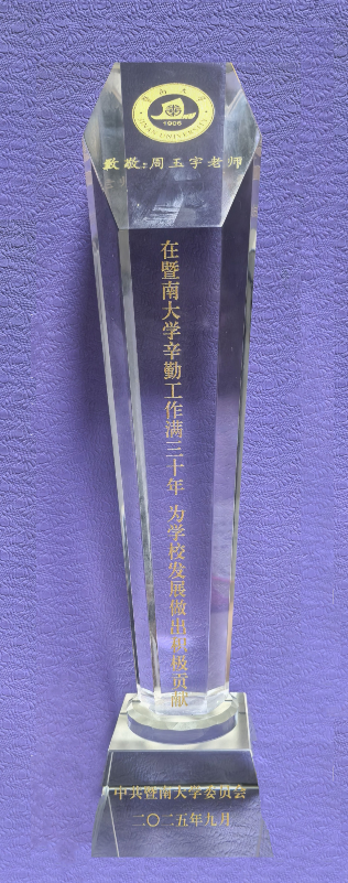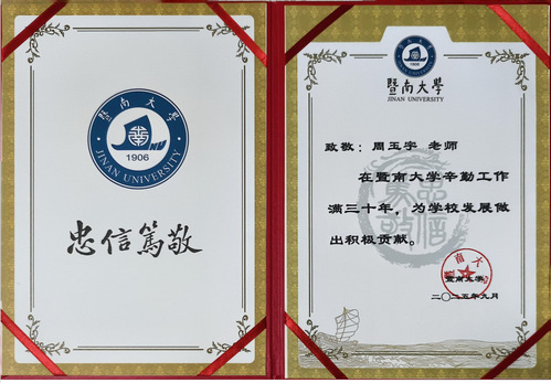 学院周玉宇老师荣获来校工作满三十年荣誉表彰