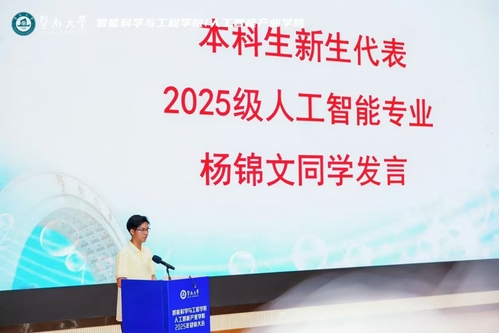 本科新生代表杨锦文以“昔送青云去,今入暨南来”抒发初入校园的激动,表示要立大志、明大德,将个人理想融入国家与民族的宏伟事业中。呼吁大家传承“忠信笃敬、知行合一、自强不息、和而不同”的暨南精神。
