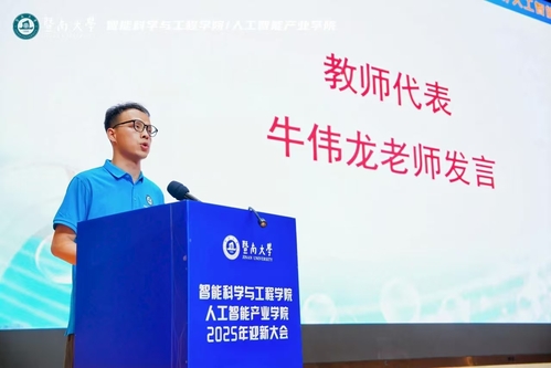 牛伟龙老师作为教师代表发言,以“探索、创新、责任”为关键词,鼓励同学们保持好奇心、培养批判性思维、关注技术伦理。“没有探索精神的学习是机械的,没有创新思维的知识是无力的”,他寄语新生在AI浪潮中既要做技术的推进者,也要做价值的守护者。