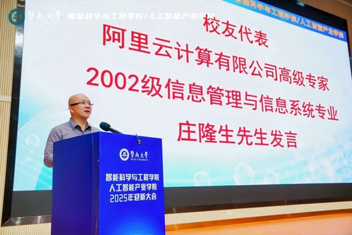 阿里云计算有限公司高级专家、学院校友联谊会副会长庄隆生,作为校友代表以“学长+新生”的双重身份亮相,与新生师弟师妹们分享亲身感悟,如今就职于阿里巴巴的他重返校园攻读高研班,坦言“坚持与机遇同样重要”。他鼓励大家在大学期间要努力坚持学习,丰富阅历,充实自我。